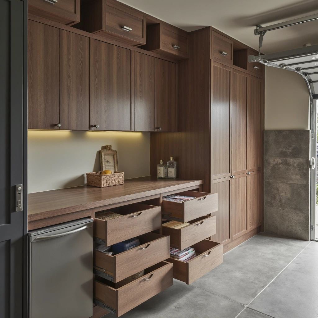 Tall cabinets equipped with pull-out drawers offer deep storage while maintaining easy access, perfect for bulky or heavy items.